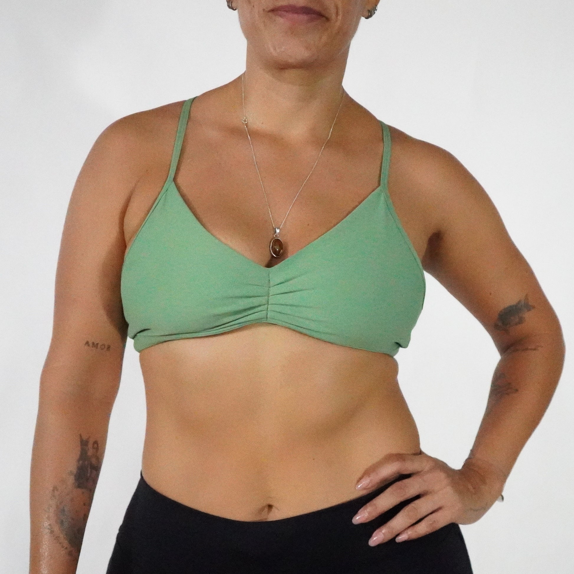 Este top deportivo en color verde forest destaca por su diseño con fruncido en la parte delantera, que aporta un ajuste cómodo y estilizado. Sus tirantes en la espalda ofrecen soporte y libertad de movimiento, ideal para actividades físicas o uso casual. Confeccionado para combinar funcionalidad y estilo, es una opción versátil para quienes buscan comodidad sin sacrificar elegancia.